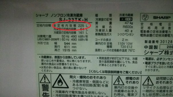 In the example in the picture below, it corresponds to the box surrounded by red. Therefore, you can see that the “total rated internal volume” of this refrigerator is 225L.