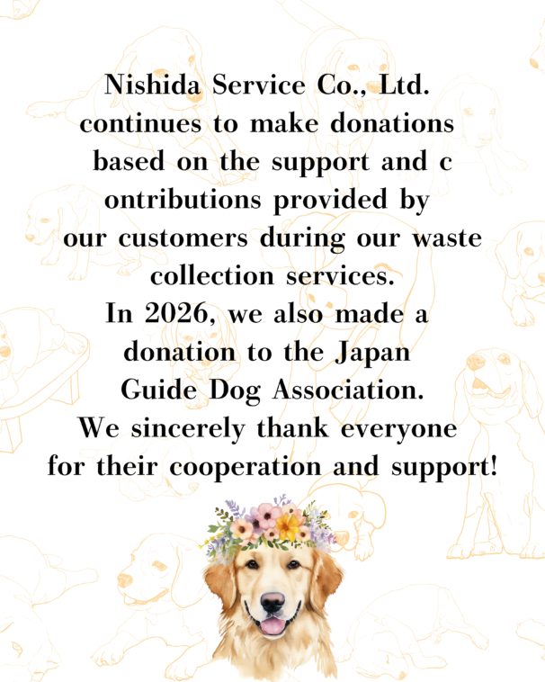 At Nishida Service, we utilize the goodwill entrusted to us by our customers through our waste collection services to make donations to guide dog training organizations.