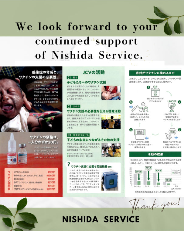 That is why Nishida Service believes that connecting the relationships we forge with society is also one of our important roles as a company.