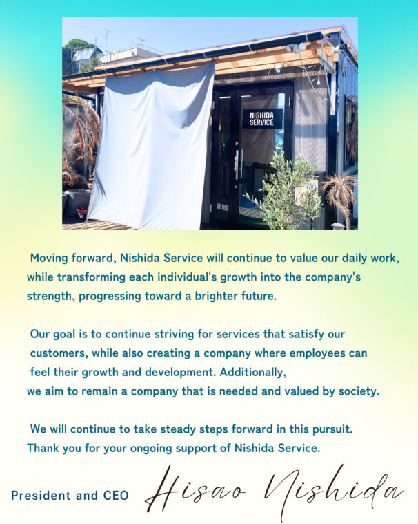 Moving forward, Nishida Service will continue to value our daily work, while transforming each individual’s growth into the company’s strength, progressing toward a brighter future.
