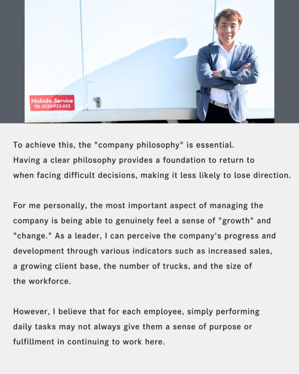 We will clearly articulate this philosophy as part of Nishida Service’s guiding principles.